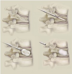 Проведение операции кифопластики: Выполняется разрез не более 1 см, через него в тело позвонка вводится специальный проводник. Сквозь проводник в тело позвонка помещают сдутый баллон с рентгеноконтрастными метками, затем его аккуратно, понемногу раздувают. Когда под действием баллона образуется полость, его сдувают и убирают. По проводнику в полость вводится костнопластический материал в пастообразном состоянии. Все этапы происходят под контролем электронно-оптического преобразователя (ЭОП). После завершения пломбировки и полимеризации рабочие инструменты извлекают, накладывают кожный шов и повязку. Вся процедура занимает около 30 минут. Пациент может вставать на следующий день после операции.